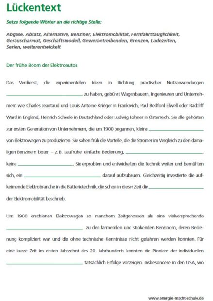 Anhand des Lückentextes setzen sich die Schülerinnen und Schüler mit dem frühen Boom der Elektroautos auseinander.