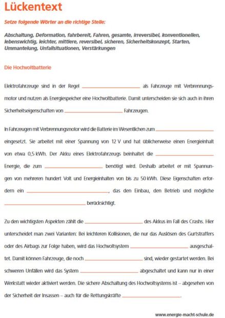 Der Lückentext bietet Schülerinnen und Schülern die Möglichkeit, sich mit der Hochvoltbatterie, deren Merkmalen und Vorteilen auseinanderzusetzen.