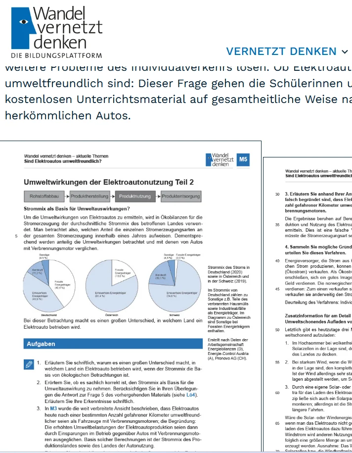Elektroautos gelten im Gegensatz zu herkömmlichen Pkws als umweltfreundlich. Stimmt das? Die Unterrichtseinheit von „Wandel vernetzt denken“ bietet zahlreiche Arbeitsmaterialien, um sich dieser Frage schülergerecht zu nähern.