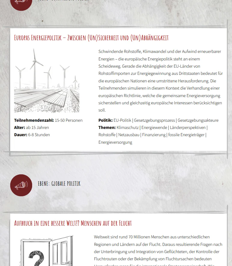 Schwindende Rohstoffe, Klimawandel und der Aufwind erneuerbarer Energien – die europäische Energiepolitik steht an einem Scheideweg. Gerade die Abhängigkeit der EU-Länder von Rohstoffimporten zur Energiegewinnung aus Drittstaaten bedeutet für die europäischen Nationen eine umstrittene Herausforderung. Die Teilnehmenden simulieren in diesem Kontext die Verhandlung einer europäischen Richtlinie, welche die gemeinsame Energieversorgung sicherstellen und gleichzeitig europäische Interessen berücksichtigen soll.