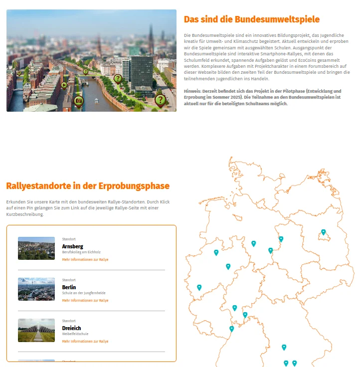 Im Rahmen des Projekts Bundesumweltspiele wird ein spielerisches Format zu Umwelt- und Nachhaltigkeitsthemen entwickelt, das sich an die Idee der Bundesjugendspiele anlehnt und von Schüler:innen an allen weiterführenden Schulen in Deutschland durchgeführt werden kann. Achtung: Noch befindet sich das Projekt in der Pilotphase.