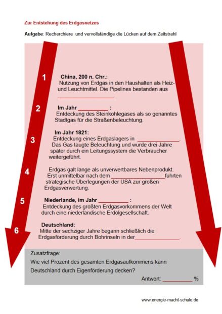Die Schülerinnen und Schüler vervollständigen in diesem Arbeitsblatt einen Zeitstrahl, welcher die Meilensteine bezüglich der Entstehung des Erdgasnetzes beschreibt. Das Arbeitsblatt kann zu Festigung von zuvor vermittelten Fakten zu diesem Thema genutzt werden.
