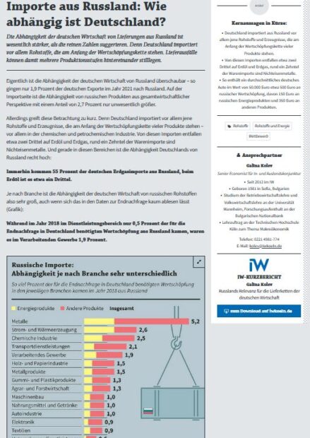Der Artikel des arbeitgebernahen Informationsdienstes des Instituts der deutschen Wirtschaft betrachtet setzt sich mit der Art und des Umfangs von Importen aus Russland auseinander.