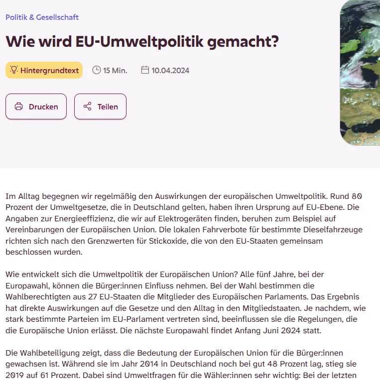 Von strengeren Abgasgrenzwerten bis zum Schutz bedrohter Arten – Umweltpolitik in der EU betrifft uns alle direkt. Doch wie entstehen eigentlich die Gesetze und Richtlinien, die in allen 27 Mitgliedstaaten gelten? Ein Blick hinter die Kulissen des komplexen Zusammenspiels von Kommission, Parlament und Rat zeigt, wie europäische Umweltstandards ausgehandelt werden. Erfahre mehr in dem Hintergrundtext von „Umwelt im Unterricht“.