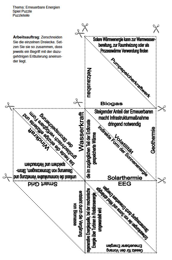 Die vier Puzzles zu den Themen „Erneuerbaren Energien“, „Netzausbau“, „Wärmekraftwerken“ und „Ökonomie der Energiewirtschaft“ eigenen sich besonders gut für die naturwissenschaftlichen Fächer sowie die Fächer Sozialkunde/Gesellschaftskunde, Politik und Wirtschaft der Sekundarstufen I und II.
