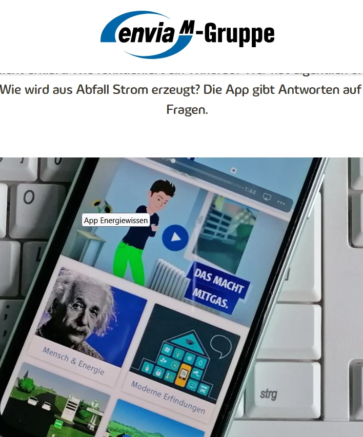 Spannende Energie-Themen, leicht erklärt: Wie funktioniert ein Windrad? Wer hat eigentlich die Glühlampe erfunden? Wie wird aus Abfall Strom erzeugt? Die App gibt Antworten auf interessante Fragen. Im Google Play Store und im Apple Store erhältlich.