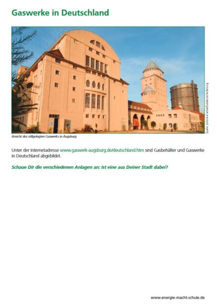 Die Schülerinnen und Schüler sind in diesem Arbeitsblatt dazu aufgefordert, eigenständig im Internet und ihrer eigenen Umgebung nach Gaswerken in Deutschland zu recherchieren und diese vorzustellen.