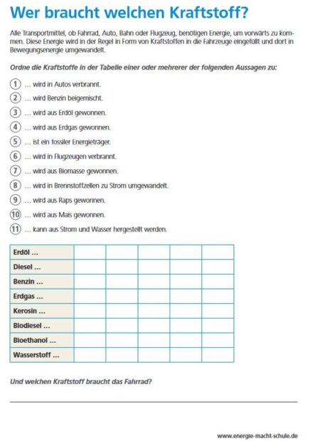 Arbeitsblatt: Wer benötigt welchen Kraftstoff?