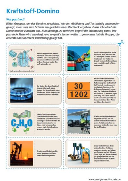 In diesem Domino ordnen die Schülerinnen und Schüler die vorgegebenen Abbildungen und Texte so aneinander, so dass sie zum Schluss ein geschlossenes Rechteck ergeben. Das Arbeitsblatt eignet sich anderem zur spielerischen und kurzweiligen Wiederholung zuvor erlernten Wissens in den Klassen 7 bis 10.