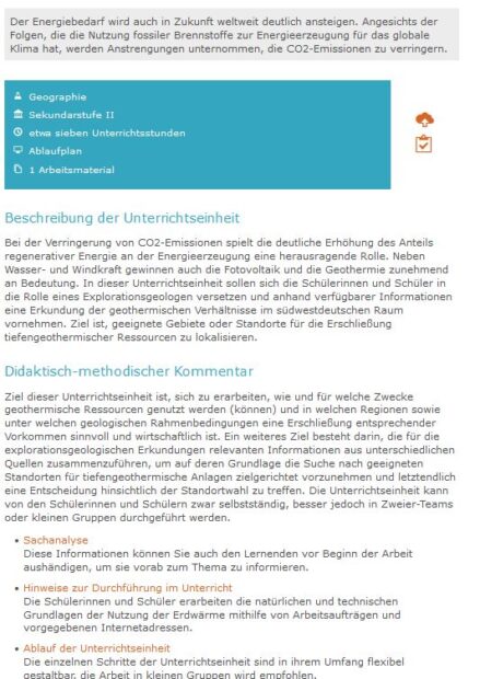 In dieser Unterrichtseinheit von Lehrer-Online versetzen sich in die Lernenden in die Rolle eines Explorationsgeologen und erkunden und anhand verfügbarer Informationen die geothermischen Verhältnisse im südwestdeutschen Raum. Ziel ist, geeignete Gebiete oder Standorte für die Erschließung tiefengeothermischer Ressourcen zu lokalisieren.