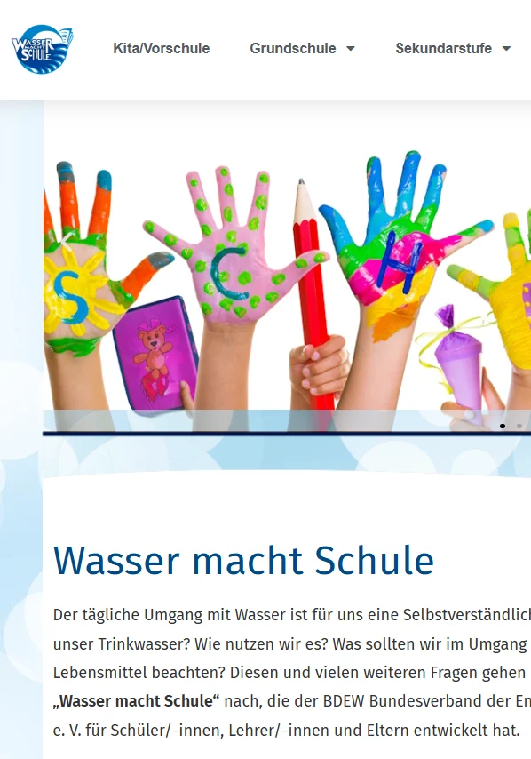 Auf „Wasser macht Schule“ hat der BDEW Bundesverband der Energie- und Wasserwirtschaft e.V. alle relevanten Informationen zum Thema Wasser übersichtlich und unterrichtsgerecht aufbereitet, um umfassend über dieses wertvolle und lebenswichtige Gut zu informieren.