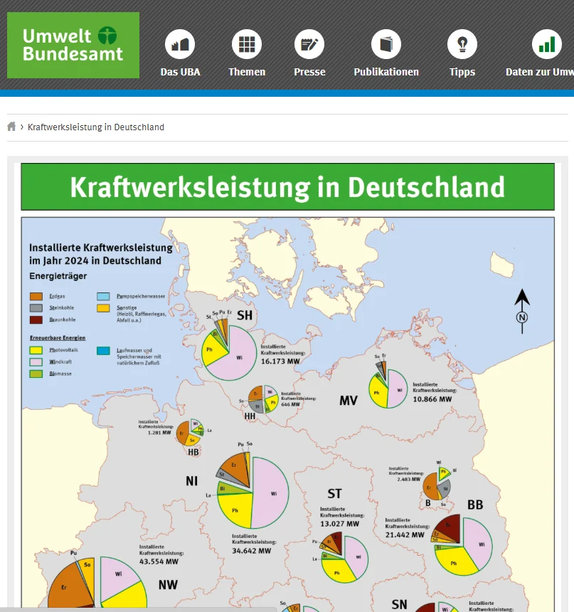 Mittels anschaulicher Karten zeigt das Umwelt-Bundesamt, wo in Deutschland von welchen Kraftwerken am meisten Leistung ausgeht. Auf einer weiteren Karte kann nachvollzogen werden, wie Kraftwerke in Deutschland im Verbundnetz integriert sind.