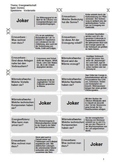 Im Domino-Lernspiel wiederholen Gruppen mit 2 bis 4 Spielern Themen der Energiewirtschaft, wie „Erneuerbare Energien“, „Kraftwerke“ und „Energieeffizienz“. Die Spieldauer beträgt etwa 20-30 Minuten.