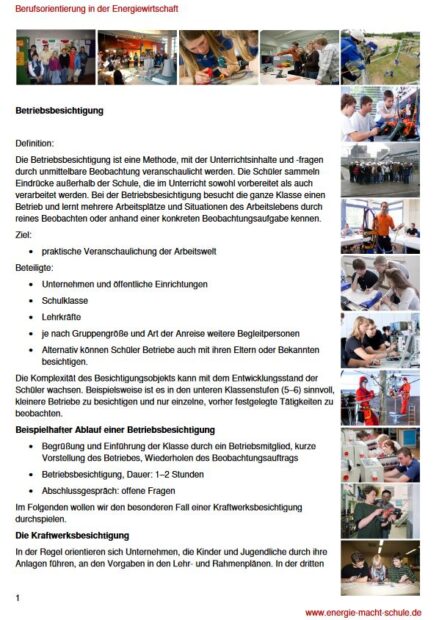 Das Arbeitsblatt definiert die Ziele und den Ablauf einer Betriebsbesichtigung. Darauf aufbauend werden verschiedene Vorschläge für eine thematisch geführte Kraftwerksbesichtigung, Anregungen zur Vorbereitung und konkreten Durchführung vor Ort gegeben. Einsatzmöglichkeiten bietet sowohl der naturwissenschaftliche als auch der technische Unterricht. Darüber hinaus stellt der fachübergreifende und fächerverbindende Unterricht Möglichkeiten zur Auseinandersetzung dar.