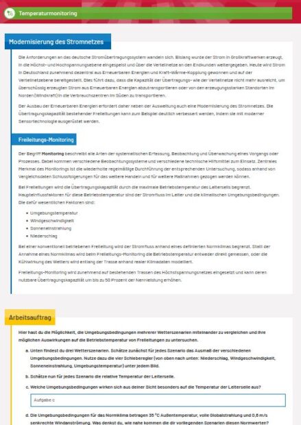 Temperaturmonitoring ist angesichts der sich wandelnden Anforderungen an das deutsche Stromübertragungssystem von zunehmender Bedeutung, da Strom immer mehr dezentral aus Erneuerbaren Energien und Kraft-Wärme-Kopplungen erzeugt wird. In der interaktiven Lernanwendung wird dieses Thema anhand praktischer Aufgaben vertieft.