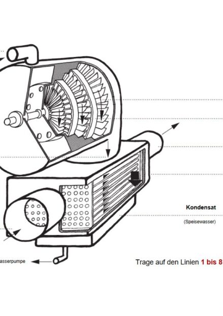 Anhand eines Schaubildes setzen sich die Lernenden mit dem Aufbau einer Turbine und eines Kondensators auseinander und beschriften im Arbeitsblatt die einzelnen Bauteile.