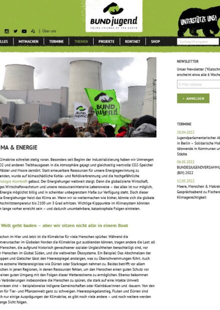 Internetauftritt des BUND jugend, die sich unter anderem auch für Klima und Energie einsetzen.
