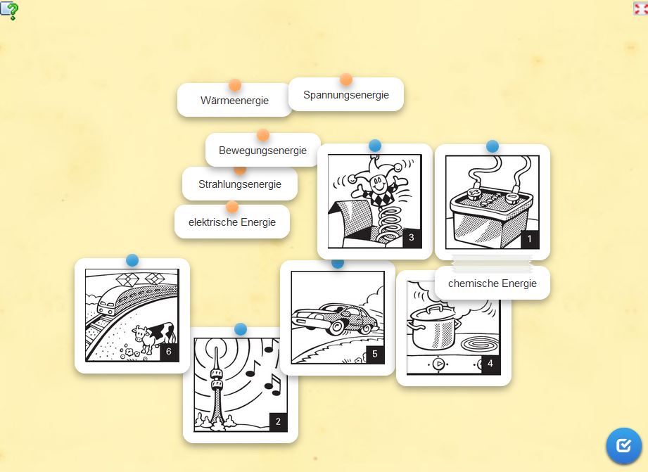 Handelt es sich bei der Energie, die aus einer Batterie gewonnen wird um chemische Energie, um Spannungsenergie oder um Wärmeenergie? Mit dieser LearningApp können dies Schülerinnen und Schüler testen.